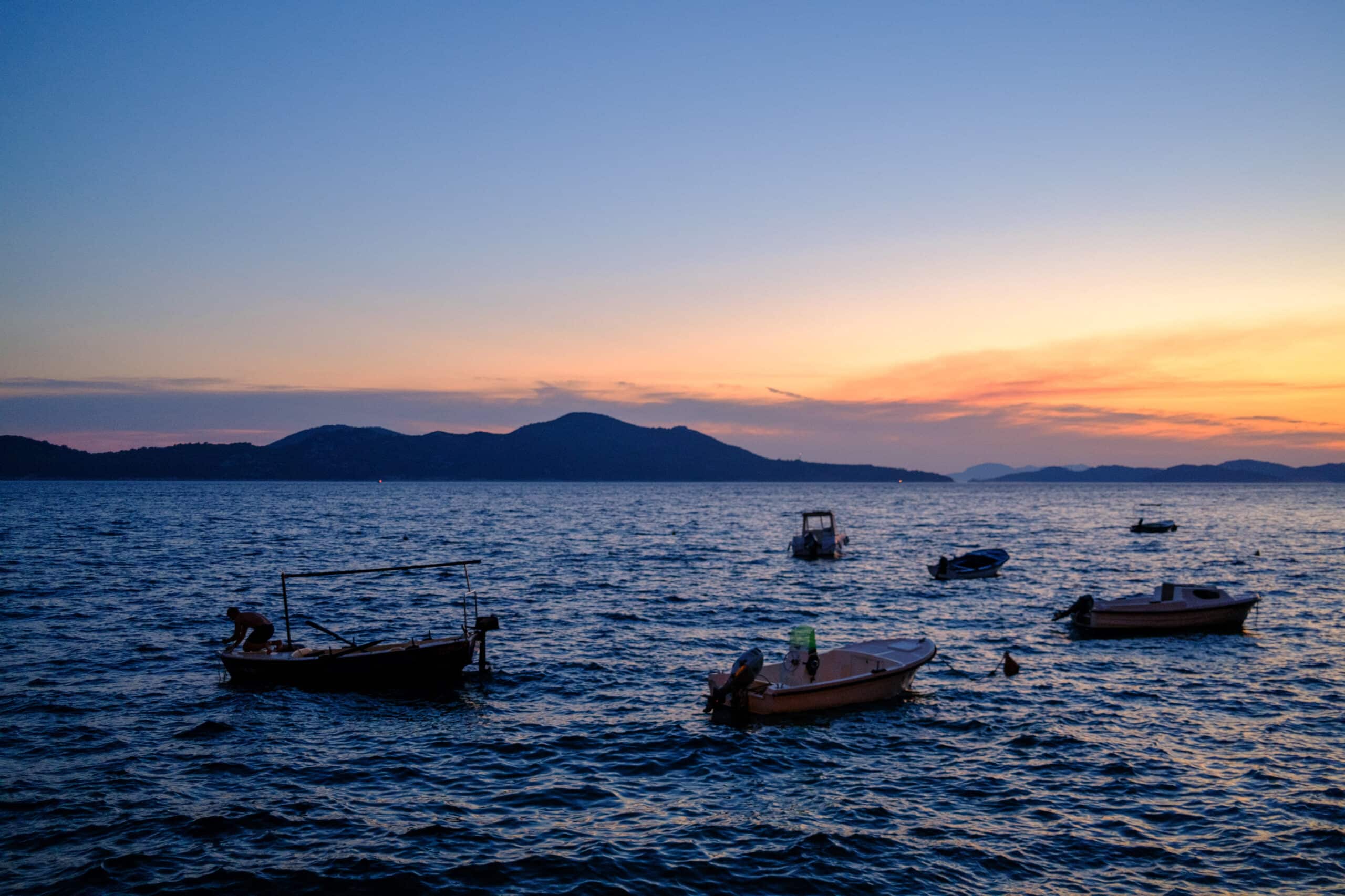 View of Orasac harbour and beach on mediterranean sea at sunset, near Dubrovnik. Orasac, Croatia. August 15, 2024. Vue du port et de la plage d Orasac sur la mer mediterranee au coucher du soleil, pres de Dubrovnik. Orasac, Croatie. 15 aout 2024. (Photo by Ugo Padovani / Hans Lucas / Hans Lucas via AFP)
