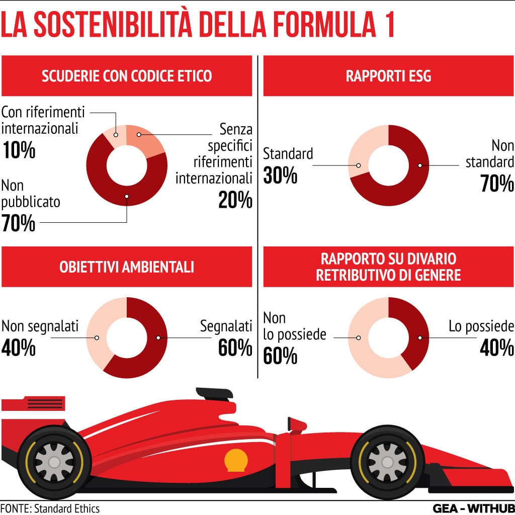 Per fotografare lo stato attuale della Sostenibilità nelle dieci scuderie osservate (Alfa Romeo, Alpha Tauri, Alpine, Astoin Martin, Ferrari, Haas, McLaren, Mercedes, Red Bull, Williamns) gli analisti di Standard Ethics hanno esaminato alcuni aspetti basilari come la presenza di un Codice Etico; la qualità e la presenza di rendicontazione ESG; la copertura del tema dei diritti umani; la divulgazione di obbiettivi ambientali.