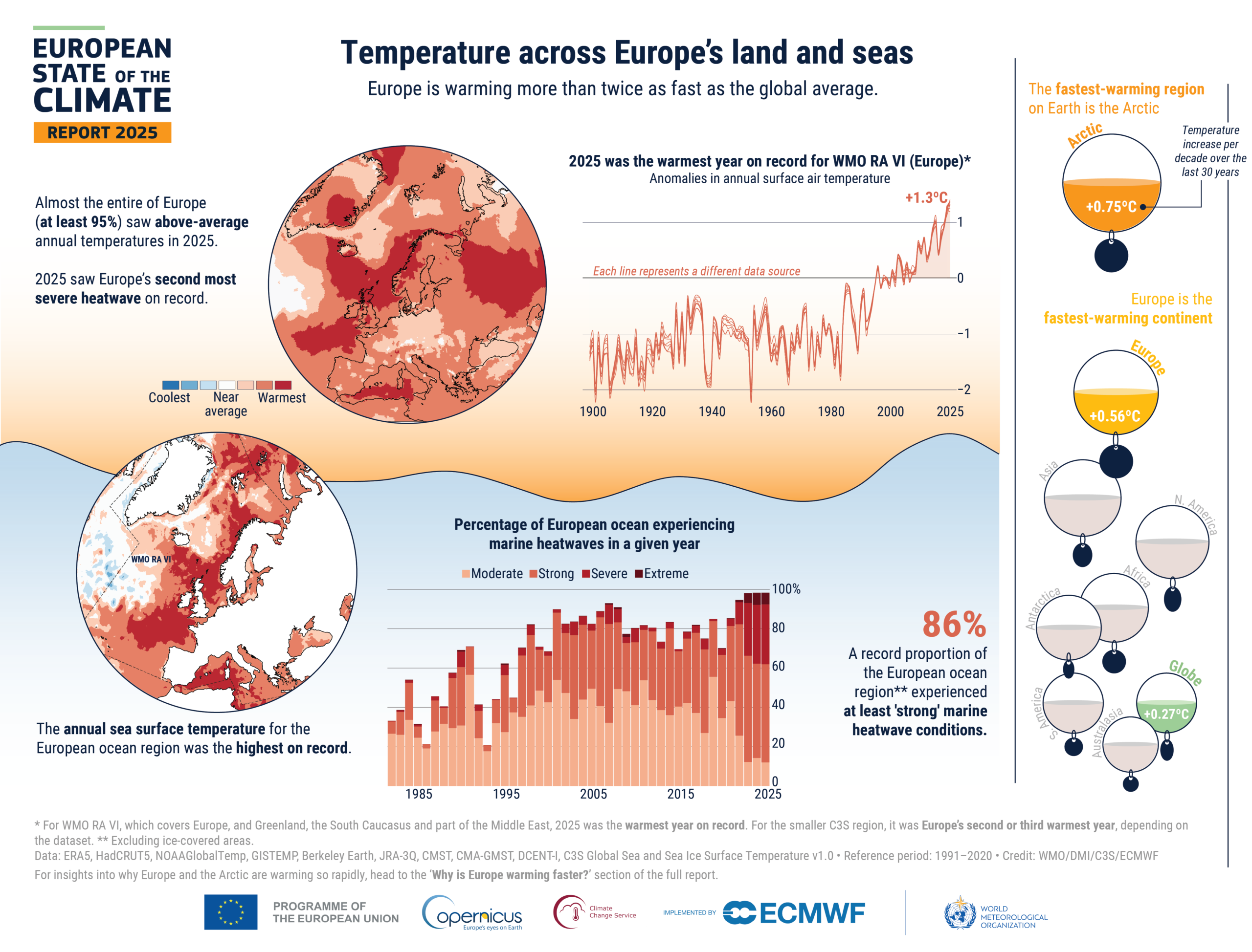 Il rapido riscaldamento in Europa sta riducendo la copertura nevosa e glaciale, mentre temperature dell’aria pericolosamente elevate, siccità, ondate di calore e temperature oceaniche record stanno colpendo regioni che vanno dall’Artico al Mediterraneo. L’Europa, insieme a molte altre regioni del globo, è esposta a impatti crescenti – da ondate di calore record sulla terraferma e in mare, a devastanti incendi boschivi e alla continua perdita di biodiversità – con conseguenze per le società e gli ecosistemi di tutta Europa. E’ quanto riporta il rapporto European State of the Climate (ESOTC) 2025, realizzato dal Centro europeo per le previsioni meteorologiche a medio termine (ECMWF), che gestisce il servizio Copernicus sui cambiamenti climatici, e dall’Organizzazione meteorologica mondiale (OMM).