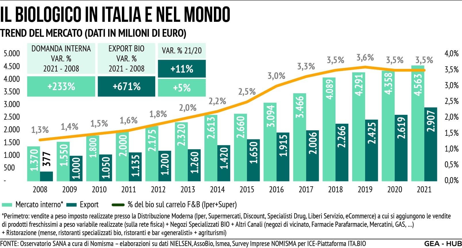 “Questo primato – spiegano dall’Osservatorio Sana – è il risultato di un lungo periodo di crescita costante e della marcia in più legata al lockdown imposto dalla pandemia, che ha visto consolidare il bio per l’aumento dei consumi domestici e il bisogno di prendersi sempre più cura della propria salute soprattutto a tavola”. Partendo da una posizione di leadership nel Vecchio Continente, si può dire che le prospettive siano rosee per l’Italia. Nel mondo il mercato bio vale oltre 117 miliardi di euro (120 miliardi di dollari) e la domanda maggiore di prodotti arriva dagli Stati Uniti, che rappresentano il 41% del mercato. Dal 2008 il mercato domestico del biologico è cresciuto del 233%, mentre l’export italiano ha raggiunto i 2,9 miliardi di euro (+671%). Insomma, un business eccellente per la patria mondiale dell’agroalimentare. E dove non arrivano le imprese specializzate con le proprie forze può intervenire il governo: “Il nostro compito – sottolinea Battistoni – è sicuramente quello di rimettere in moto gli acquisti e i consumi, incentivando la domanda, comunicando e informando. Le intese raggiunte in Conferenza Stato Regioni, con il finanziamento di 5 milioni di euro da destinare alle mense scolastiche, va proprio in quella direzione. È ovvio – conclude il sottosegretario – che aumentare la conoscenza e la formazione verso il consumo dei prodotti biologici aiuterà il settore ad invertire la flessione registrata quest’anno”.