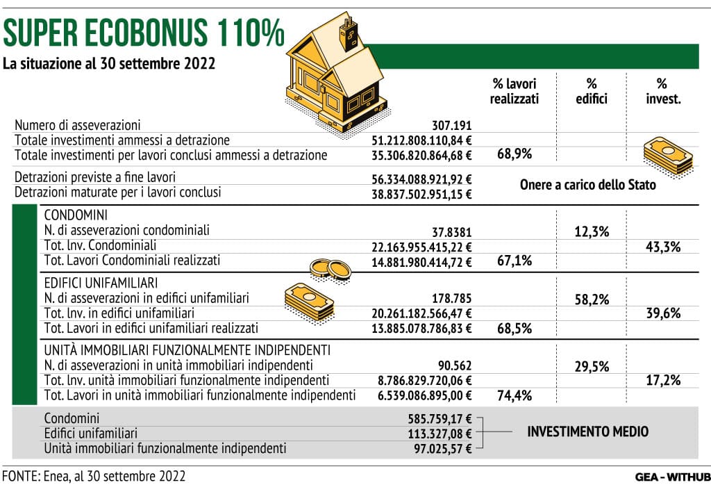 I cantieri attivati in Italia con il Superbonus 110% (per la precisione definito ‘Super ecobonus’) al 30 settembre 2022, come riferisce Enea (Agenzia nazionale per le nuove tecnologie, l’energia e lo sviluppo economico sostenibile), sono 307.191 (asseverazioni depositate). Le detrazioni maturate per i lavori conclusi sono 38 miliardi e 837 milioni di euro che saliranno a 56 miliardi e 334 milioni di euro a fine lavori. Il totale degli investimenti ammessi a detrazione sono invece 51 miliardi e 212 milioni. Alla fine del mese scorso risultava realizzato il 68,9% dei lavori.