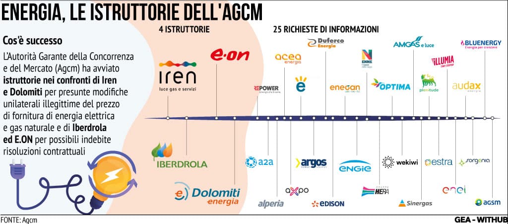 Inoltre, l’Antitrust ha inviato una richiesta di informazioni ad altre 25 società: A2A Energia, Acea Energia, AGSM ENERGIA, Alleanza Luce & Gas, Alperia, AMGAS, ARGOS, Audax Energia, Axpo Italia, Bluenergy Group, Duferco Energia, Edison Energia, Enegan, Enel Energia, Engie Italia, Eni Plenitude, Enne Energia, Estra Energie, Hera Comm, Illumia, Optima Italia, Repower Italia, Sinergas, Sorgenia, Wekiwi.
