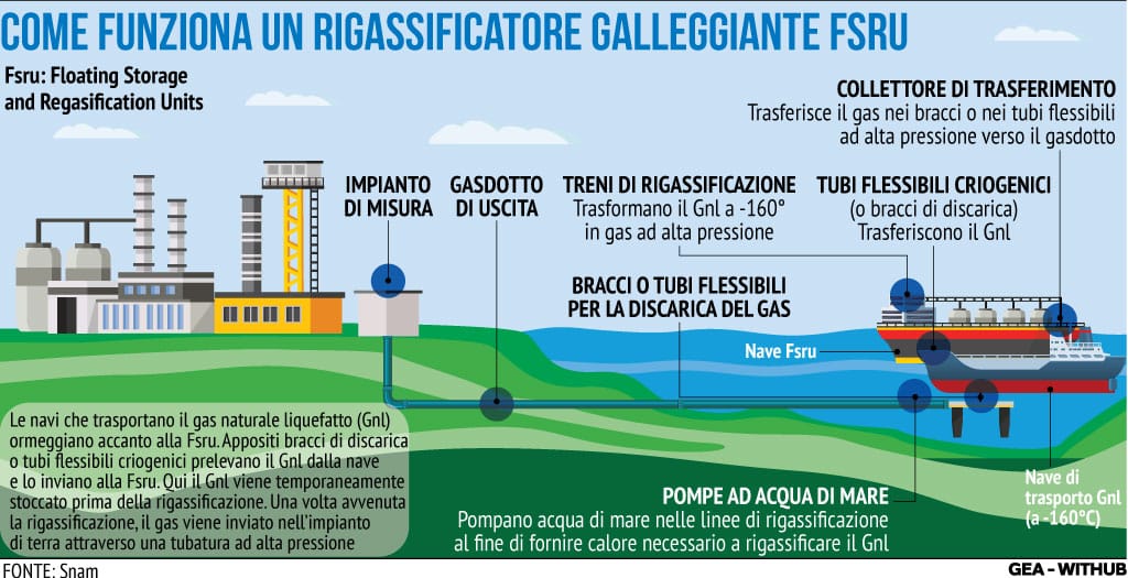 Intanto, come riportato dal sito specializzato Euractiv, ci sarebbero più di 35 navi metaniere ferme attorno alle coste della Spagna e nel Mediterraneo in attesa di scaricare i propri carichi di Gnl. I rigassificatori europei (in Italia ne esistono tre) non riescono ad accogliere altri carichi. In pratica, il gas naturale liquefatto destinato a sostituire completamente le forniture di metano dalla Russia nel 2024 attende le infrastrutture necessarie per poterlo utilizzare.