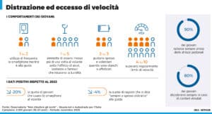 Non a caso, il 41% di chi ha partecipato a momenti formativi di quel tipo afferma di aver cambiato in modo significativo e duraturo il proprio comportamento, sia nelle vesti di conducente sia come passeggero o pedone. E un ulteriore 43% parla di un impatto positivo, seppur temporaneo. In totale, dunque, 8 giovani su 10 riconoscono un effetto concreto di tali attività. Dallo studio emerge che quasi 1 giovane su 2 – conducente abituale di un mezzo di trasporto (dall’automobile al motociclo, passando per bici e monopattini) – utilizza di frequente lo smartphone mentre è alla guida; 1 su 5 ammette di essersi messo più di una volta al volante sotto l’effetto di alcol, sostanze o farmaci che riducono la lucidità; 2 su 3 guidano spesso e volentieri quando sono stanchi o affaticati; 4 su 10 superano regolarmente i limiti di velocità.
