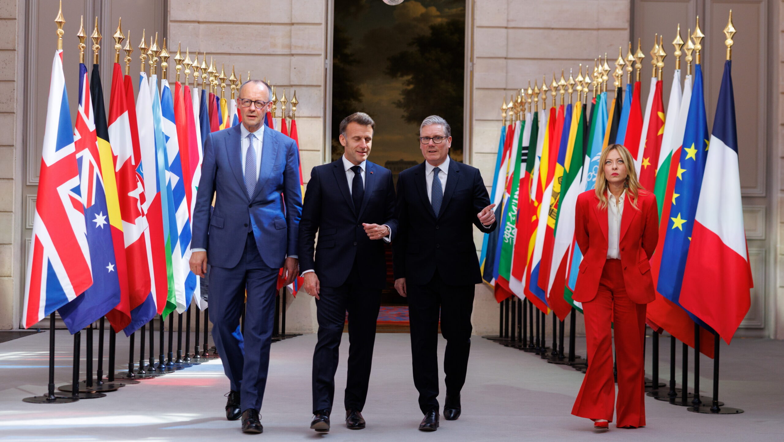 FRIEDRICH MERZ CANCELLIERE DELLA REPUBBLICA FEDERALE DI GERMANIA, EMMANUEL MACRON PRESIDENTE FRANCIA, KEIR STARMER PRIMO MINISTRO INGLESE, LA PRESIDENTE DEL CONSIGLIO GIORGIA MELONI