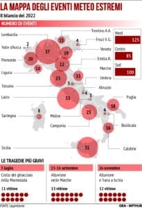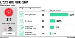 Si sono registrate temperature eccezionali già da maggio con punte di 36,1°C a Firenze, 35,6°C a Grosseto, 34°C a Pisa e 32,8°C a Genova. Ma anche a Ustica con 33,4°C e Torino con 29,2°C. Il mese di giugno ha visto un’anomalia della temperatura media di +3,3°C se consideriamo l’Italia nel suo insieme, con punte di 41,2°C a Guidonia Montecelio (RM), 40°C a Prato, Firenze, Viterbo e Roma. A luglio record per le città lombarde: a Brescia e Cremona si sono registrati 39,5°C, a Pavia 38,9°C e a Milano 38,5°C. Ad agosto i termometri hanno segnato tra i 40 e i 45°C a Palermo, Catania e Reggio Calabria, mentre a Bari si è arrivati a 39°C. Questi livelli di caldo eccezionale, prolungati per settimane e mesi in gran parte del Paese, hanno portato a gravi conseguenze sulla salute umana. L’ondata di calore che ha impattato più duramente è stata quella della seconda metà di luglio, con un aumento di mortalità che ha raggiunto, stando ai dati di Ministero della Salute e Dipartimento di Epidemiologia della Regione Lazio, il 36% in tutte le aree del Paese, ma in particolare in alcune città del nord. Tra le città maggiormente colpite Torino che ha visto un eccesso di mortalità pari a +70%, a cui segue Campobasso (+69%), poi Bari (+60%), Bolzano (+59%), Milano e Genova (+49%), Viterbo (+48%), Firenze (+43%), Catania (+42%). Solo nel 2022 sono stati oltre 2.300 i decessi in Italia dovuti alle ondate di calore, secondo le analisi del ministero della Salute e Dipartimento di Epidemiologia della Regione Lazio, in crescita rispetto ai 1.472 del 2021 e ai 685 del 2020.
