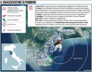 Le operazioni di trasbordo del primo cargo di Gnl sono state effettuate da Eni, che ha acquisito capacità di rigassificazione a Piombino nell’ambito della strategia di diversificazione delle forniture di Gnl verso l’Italia attraverso il gas di propria produzione internazionale, facendo leva sulle relazioni con i Paesi produttori in cui opera, aumentando i volumi di gas disponibili da Algeria, Libia e Italia e incrementando i carichi di Gnl da Egitto, Congo, Qatar, Angola, Nigeria, Indonesia e Mozambico.