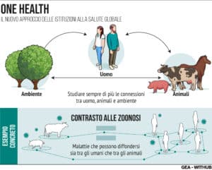 Dallo scoppio della pandemia Covid-19 è diventato più urgente tradurre questo concetto astratto in azioni concrete e strumenti tangibili per prevenire problemi di salute pubblica. La scienza stima che, dopo quella del coronavirus, il 70% delle future pandemie deriverà da malattie zoonotiche, ovvero infezioni che possono essere trasmesse direttamente o indirettamente tra animali e l’uomo. Così come uomini e animali possono essere infettati dagli stessi microbi, dal momento che condividono gli stessi ecosistemi. Da qui l’imperativo di comprendere meglio i legami che esistono tra salute umana, animale e anche ambientale, dal momento che far convergere gli sforzi in un solo settore può non essere risolutivo per la prevenzione di malattie che rischiano di mettere in pericolo la salute globale. Intervenendo sul controllo delle malattie degli animali, si può ad esempio limitare anche la loro trasmissibilità all’uomo. Ma c’è anche una forte componente legata all’ambiente e alla salute dell’ecosistema che ci circonda. Ad esempio, proprio nel caso del Covid-19, si ritiene che la sopravvivenza e trasmissibilità del virus siano state influenzate anche da altri fattori legati al clima, come le temperature e l’umidità, oltre che dalle caratteristiche del virus stesso. Inoltre, secondo vari esperti, gli agenti ambientali e atmosferici sono stati fattori che hanno favorito lo sviluppo della pandemia, soprattutto nei primi mesi del 2020 e nelle aree più esposte a inquinamento urbano e industriale.